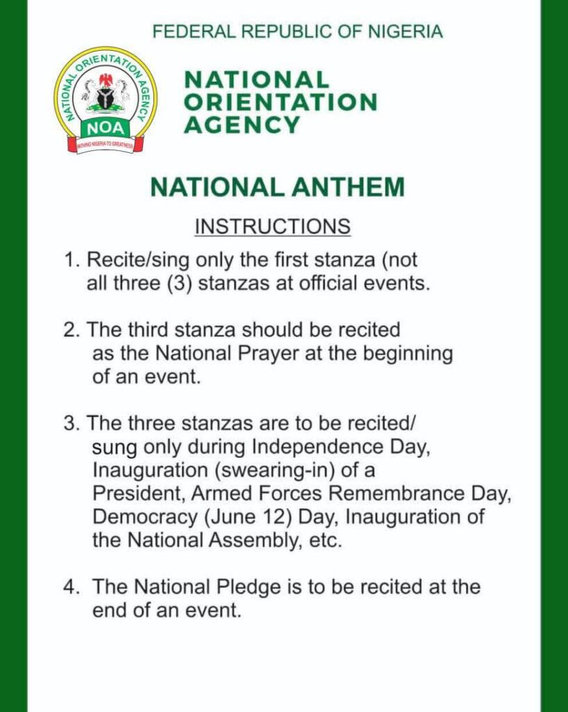 According to a statement issued on Thursday by the National Orientation Agency (NOA), only the first stanza of the anthem should be sung at official events, while the third stanza will now serve as the National Prayer at the start of such occasions.