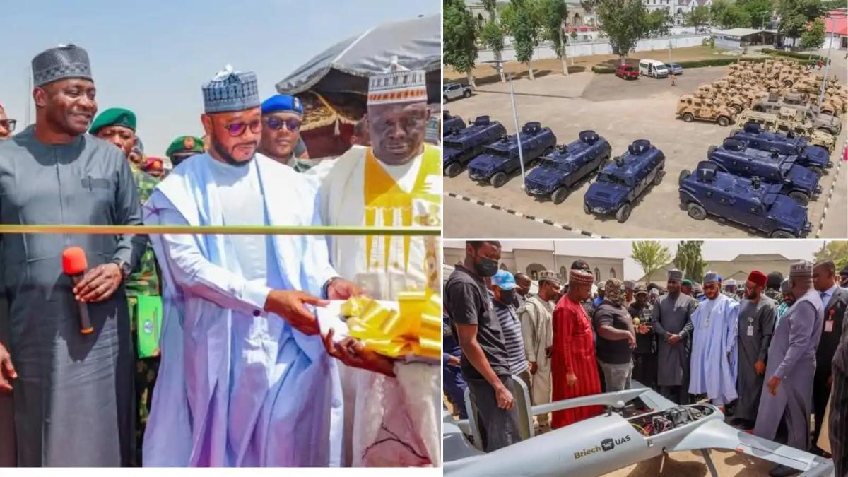 Dauda Lawal delivers 25 armoured vehicles and drones to troops, strengthening counterterrorism efforts.