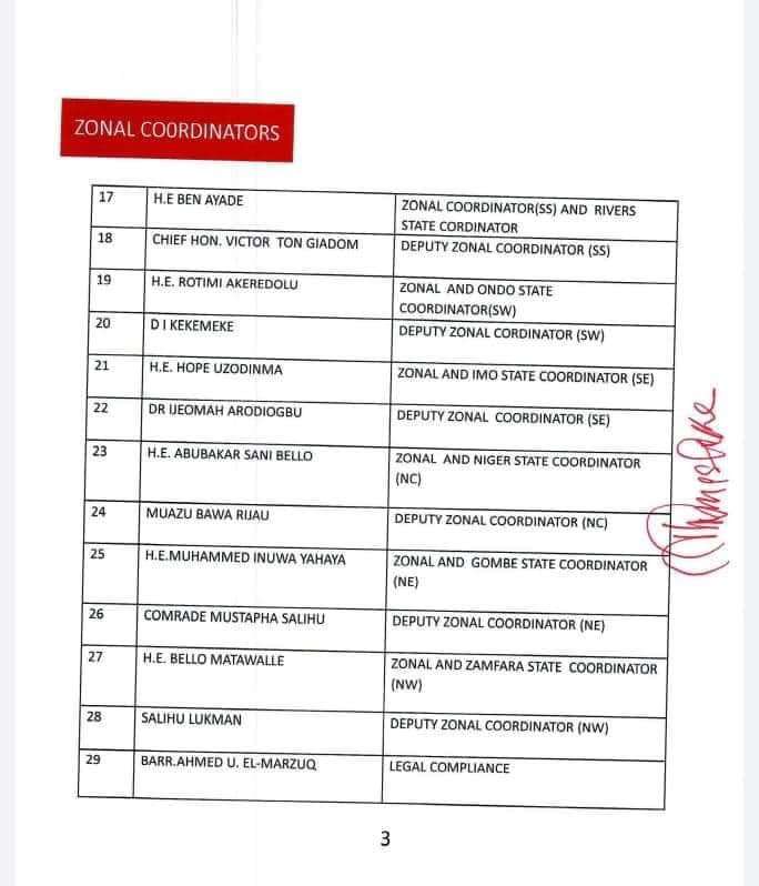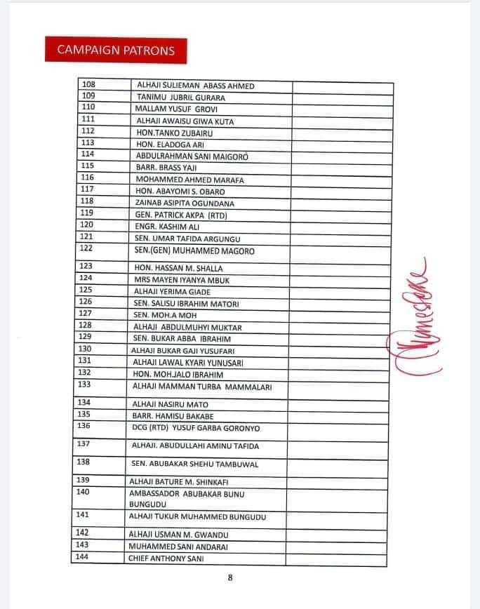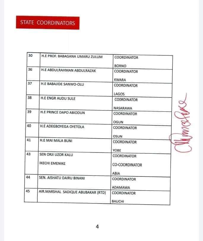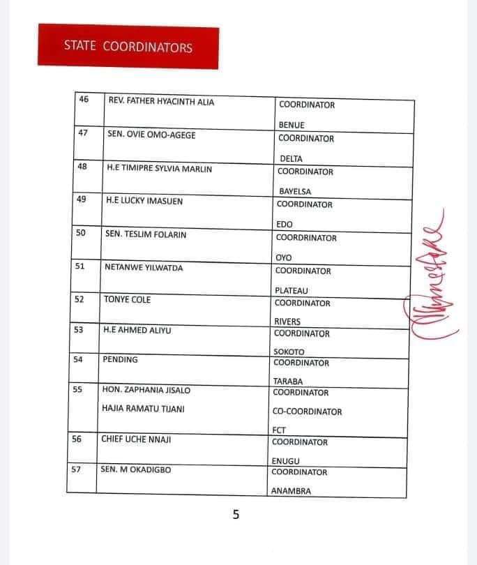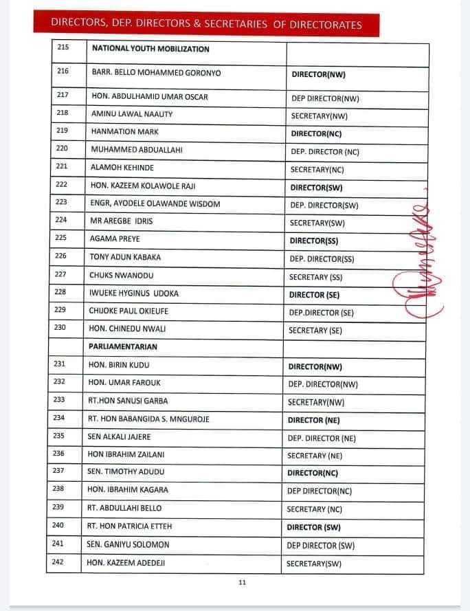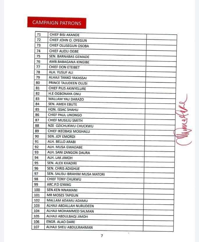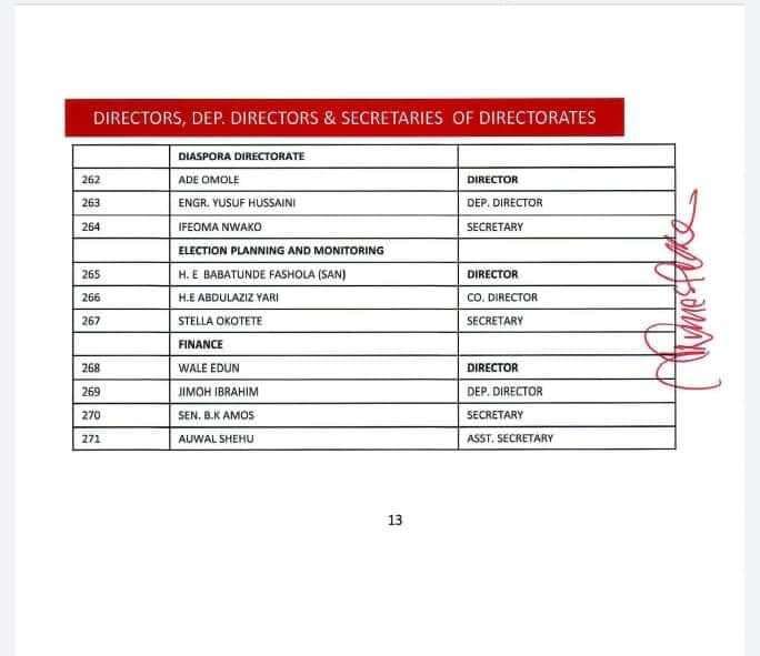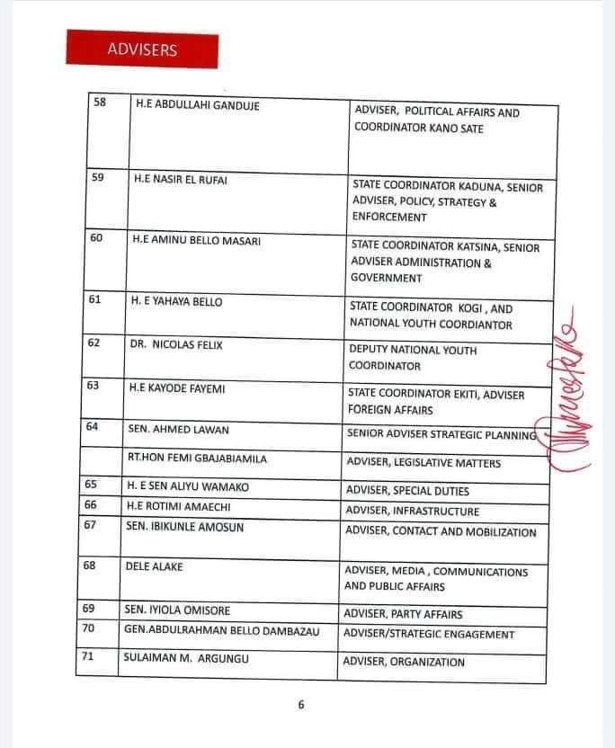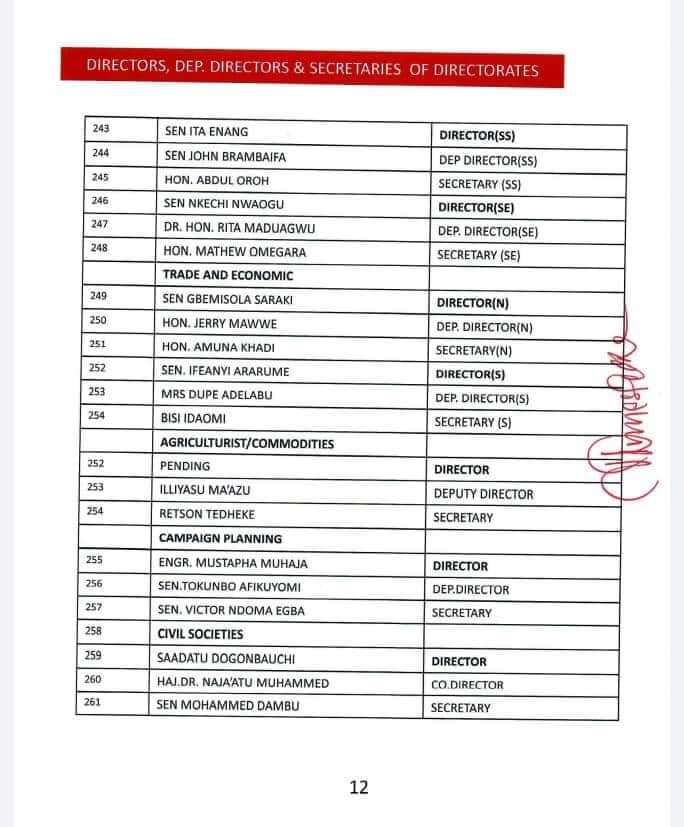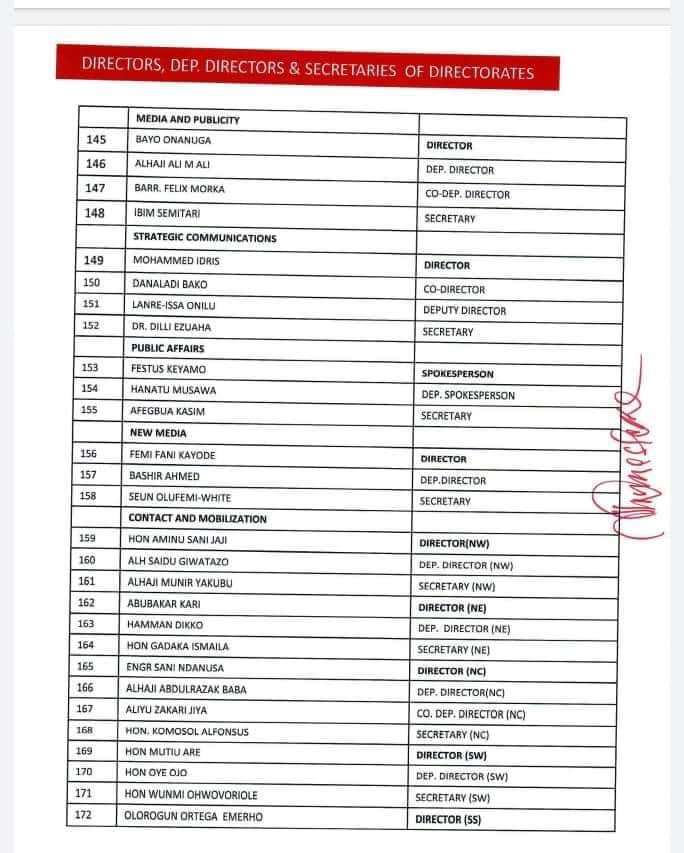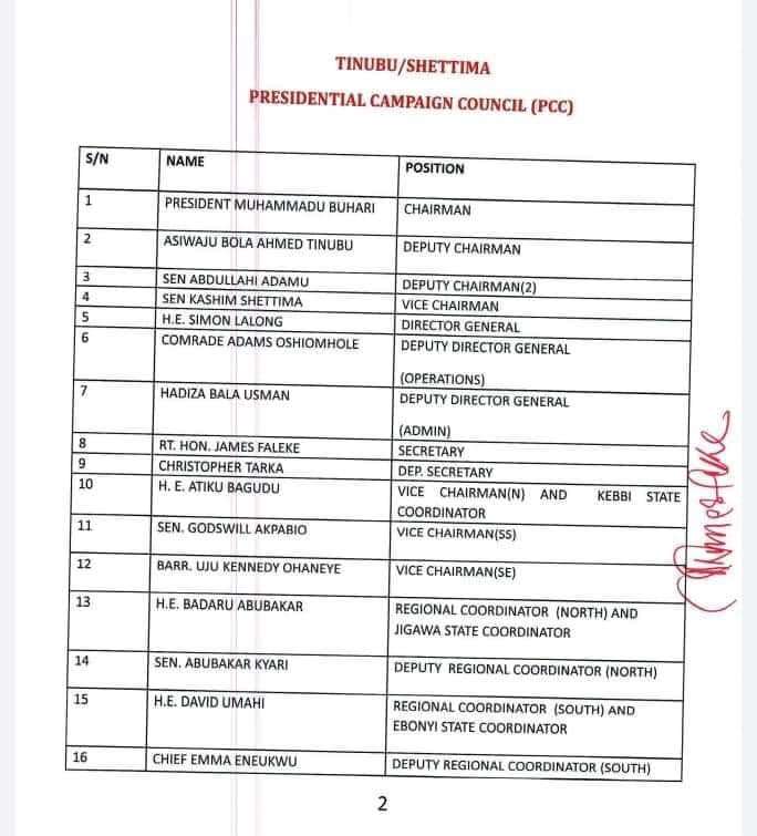 The 422-man list released by James Faleke, the Presidential Campaign Council Secretary, late Friday, has the presidential candidate and the party’s national chairman, Abdullahi Adamu, as deputy chairman 1 and 2 respectively.