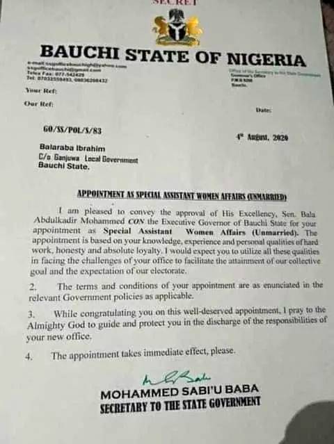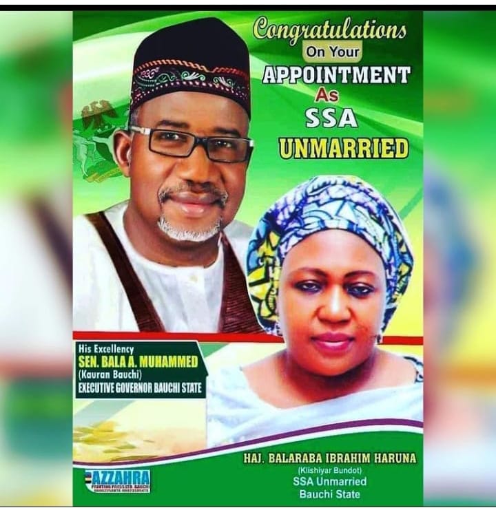 “I am pleased to convey the approval of His Excellency, Senator Bala Abdulkadir Mohammed CON, the Executive Governor of Bauchi State, for your appointment as Special Assistant Woman Affairs (Unmarried).