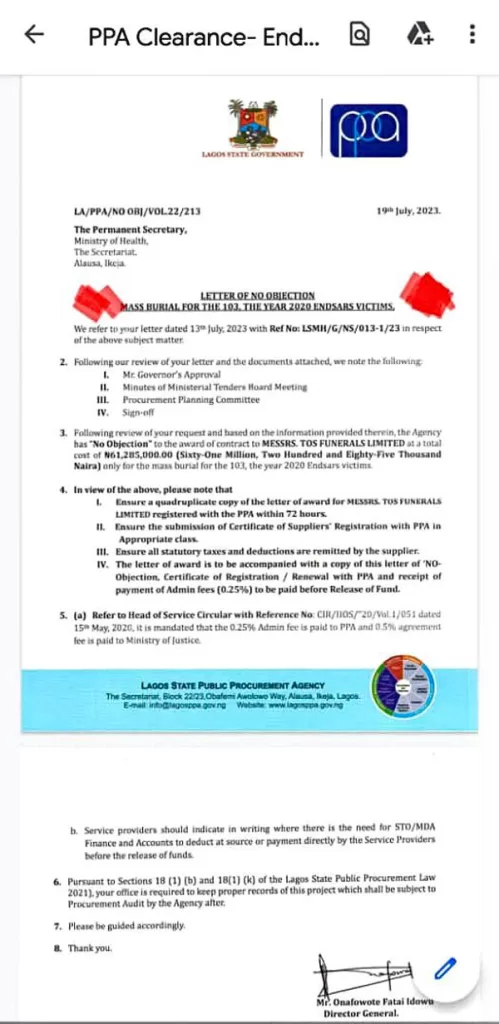 A leaked memo addressed to the Lagos State Ministry of Health has stirred public outrage, revealing that the Lagos State Government approved a sum of N61,285,000 for the mass burial of 103 individuals identified as victims of the 2020 ENDSARS protests.