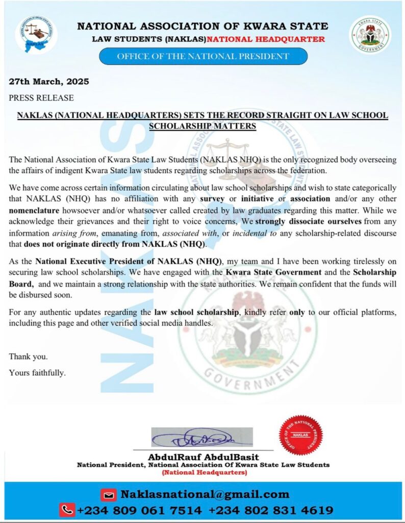 The National Association of Kwara State Law Students (NAKLAS NHq) has clarify its stance on law school scholarships.