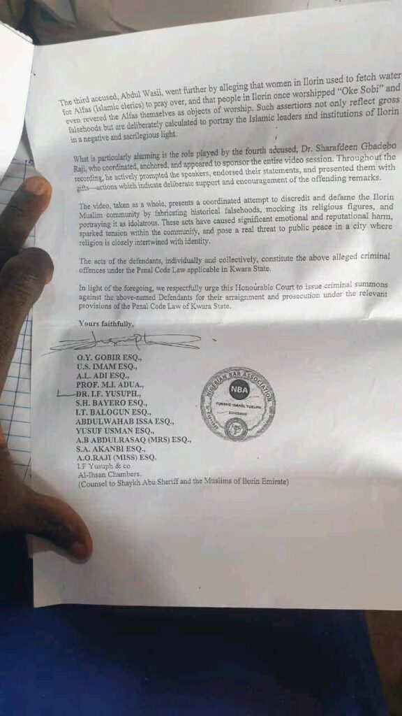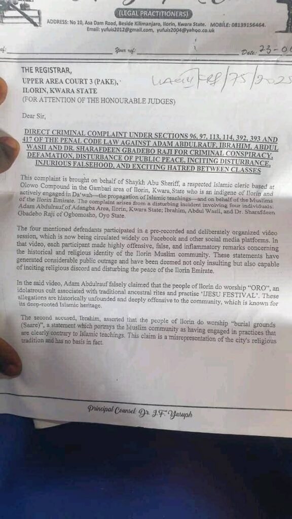 Principal Counsel Dr. J.F. Yusuph, leading a team of over a dozen lawyers, stated in the complaint that the video’s content has caused significant outrage, emotional distress, and reputational damage to Ilorin Muslims, adding that it poses a serious risk to public peace in a city where religion is closely tied to identity.